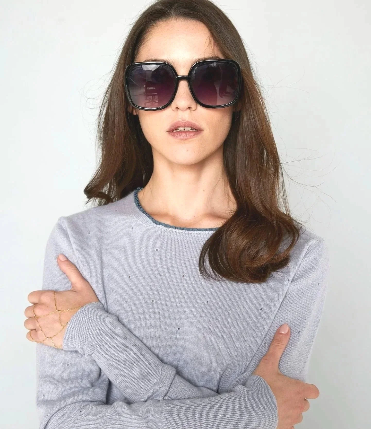 Jan is 170cm/5’7” and is wearing a size 1 sweater designed for a loose fit.