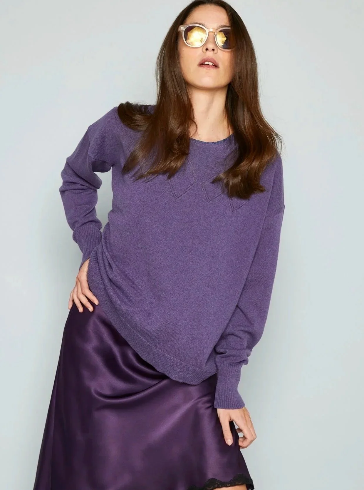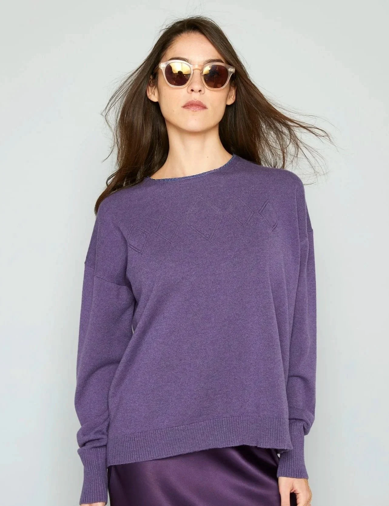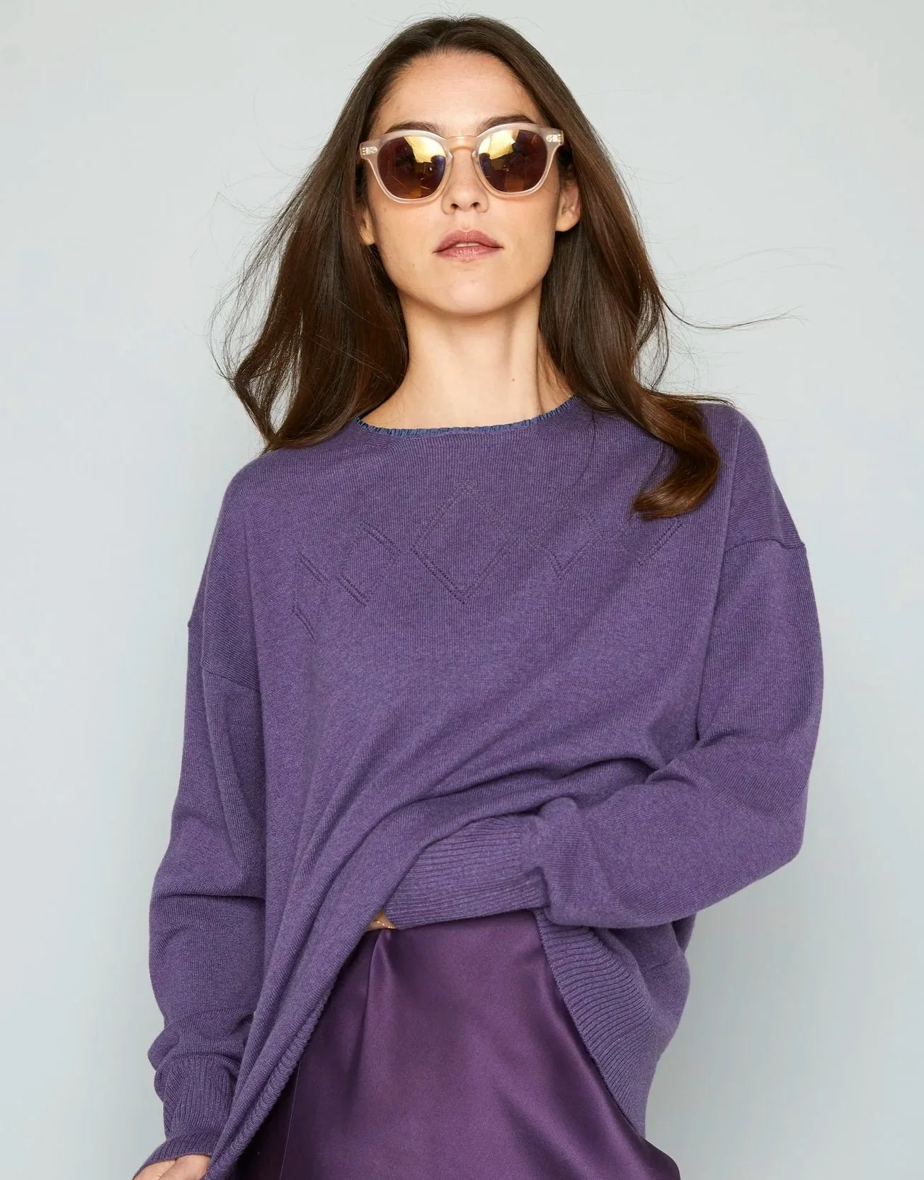 This lavender cashmere turtleneck sweater showcases an intricate open work stitch motif on the front.